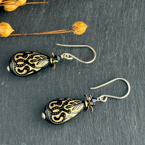 Czech Glass Black and Silver Cathedral Earrings in Sterling Silver