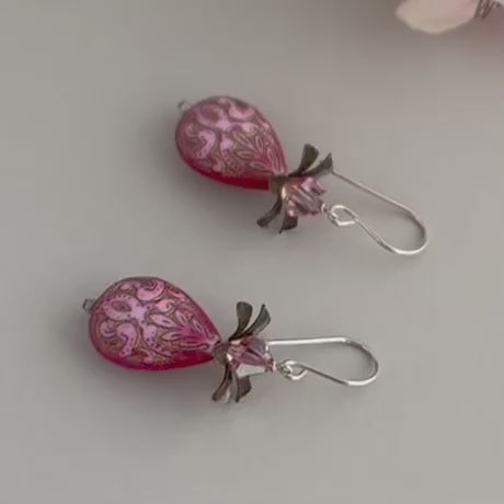 Funky Vintage Czech Lampwork Glass Pink Foil Earrings in Sterling Silver