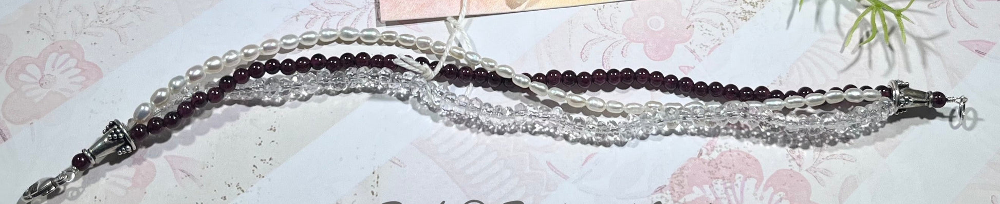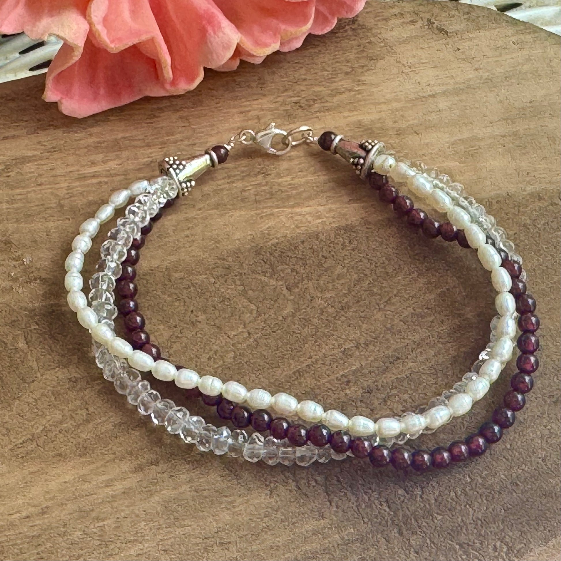 - Attractive three-strand bracelet, containing one strand of 3.5MM round garnets, 4MM freshwater rice pearls and 4MM crystal quartz rondells.