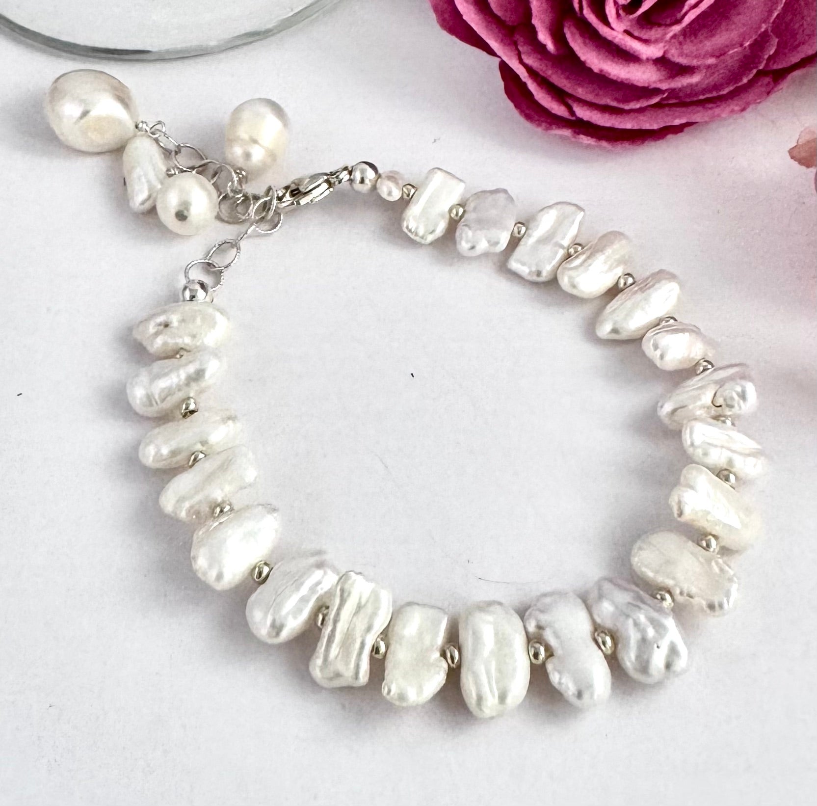 - Made with a variety of freshwater pearls. Horizontal Biwa pearls measure 10MM x 6MM.